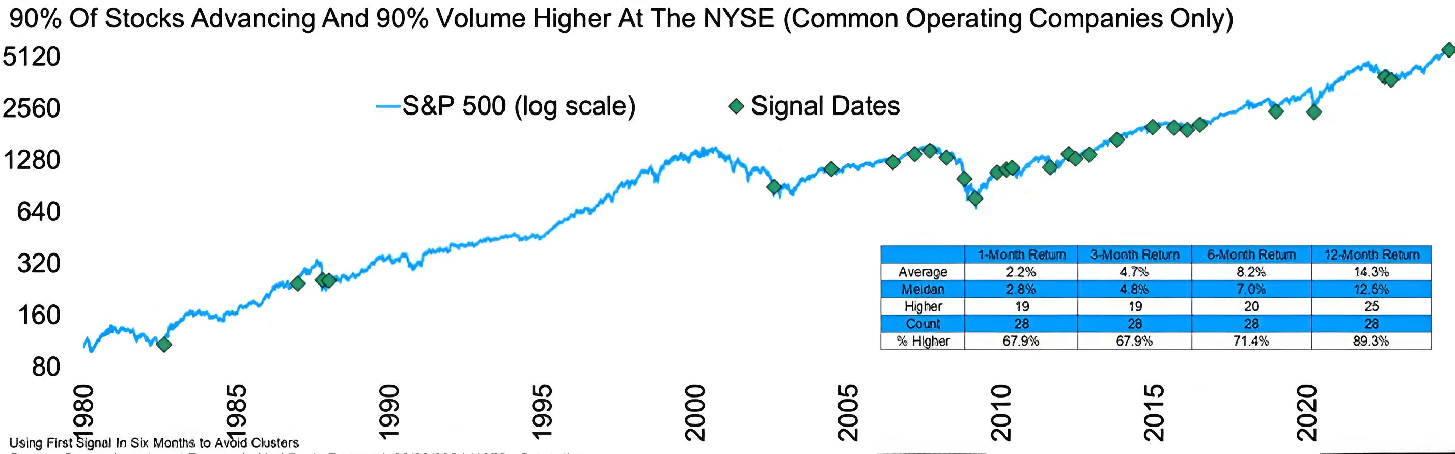 The chart above shows the S&P 500 from 1979 with times that 90% of stocks are advancing and 90% of the volume at the NYSE is higher.