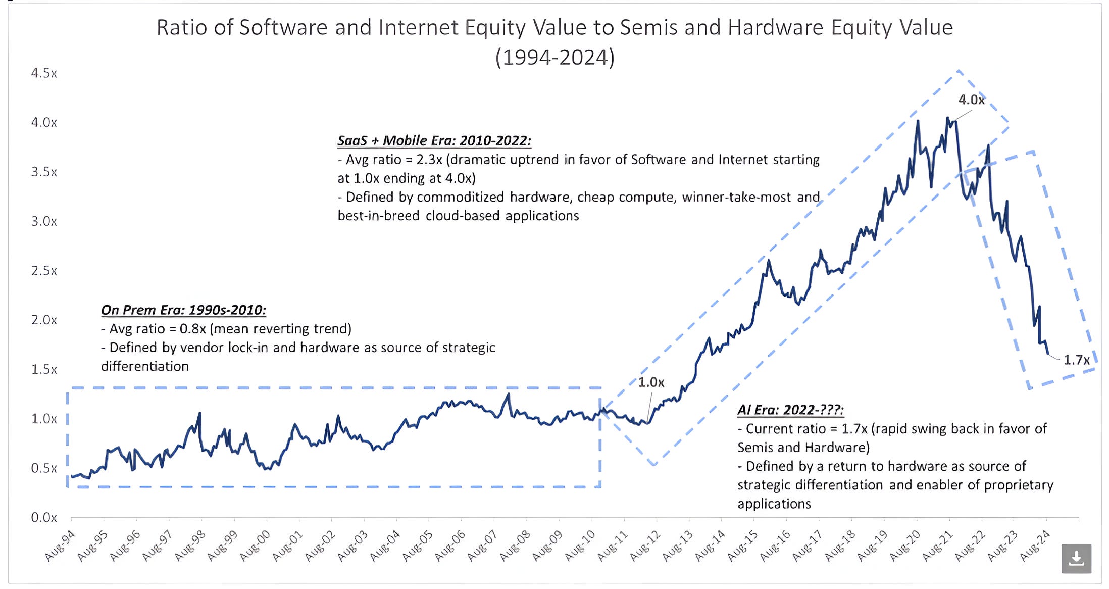 The chart above shows the Ratio of Software and Internet stocks to Semiconductor and Hardware shares from 1994-2024.