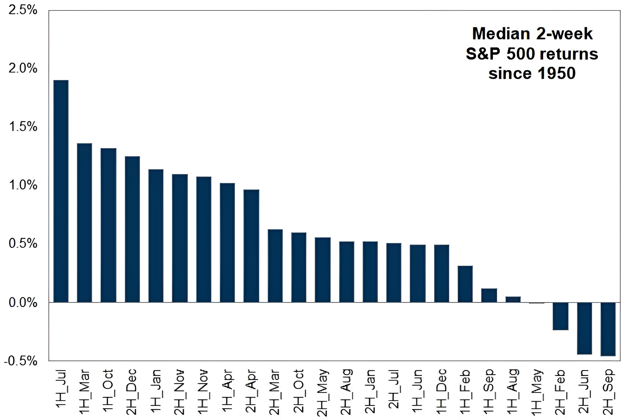The chart above shows the median returns of the S&P 500 for each half-month since 1950.