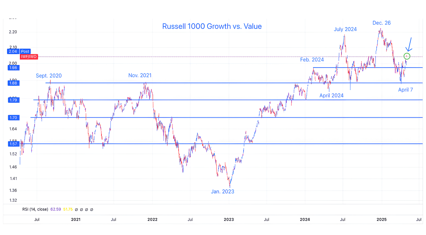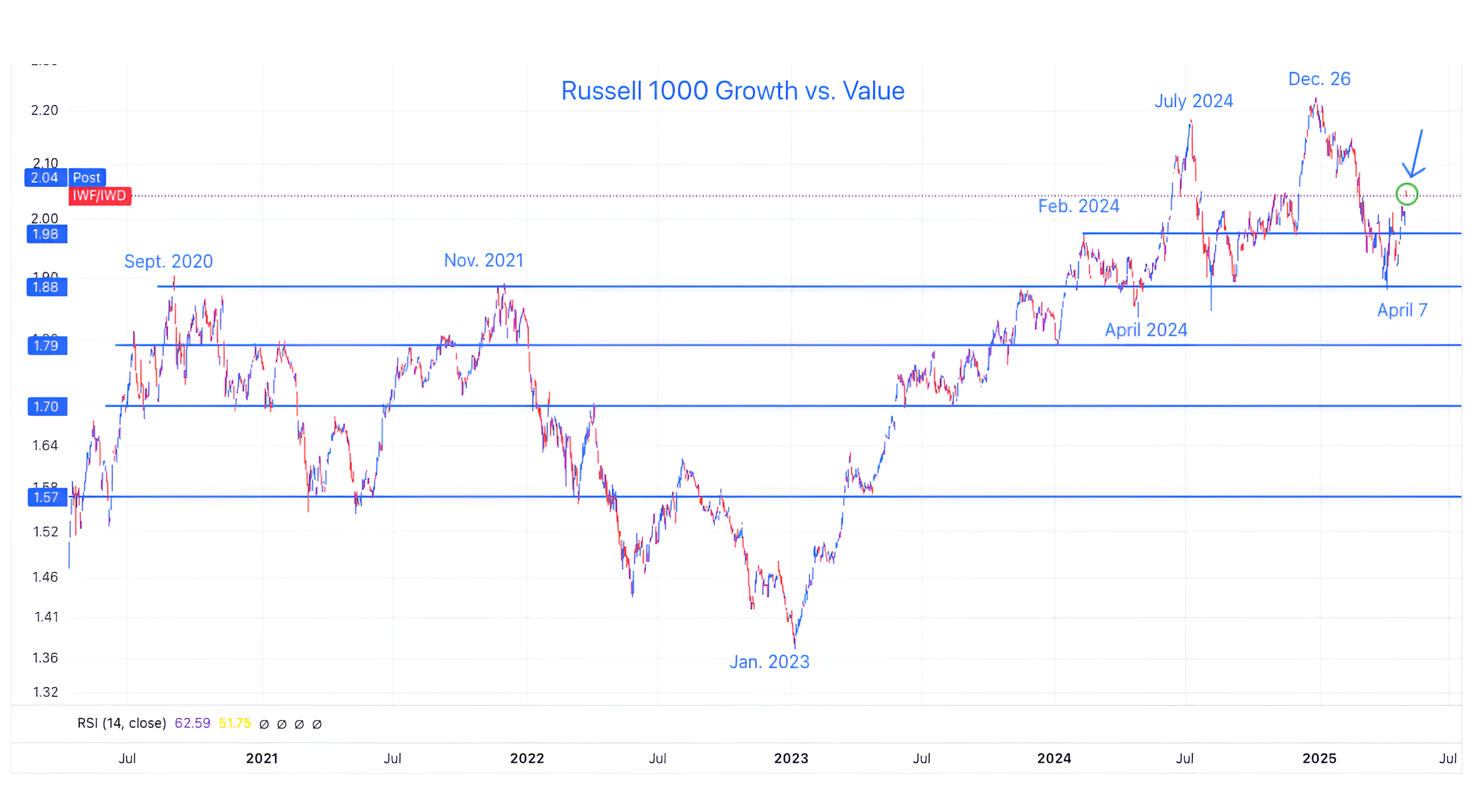 The chart above shows the Russell 1000 Growth ETF (ticker: IWF) relative to the Russell 1000 Value ETF (ticker: IWD).