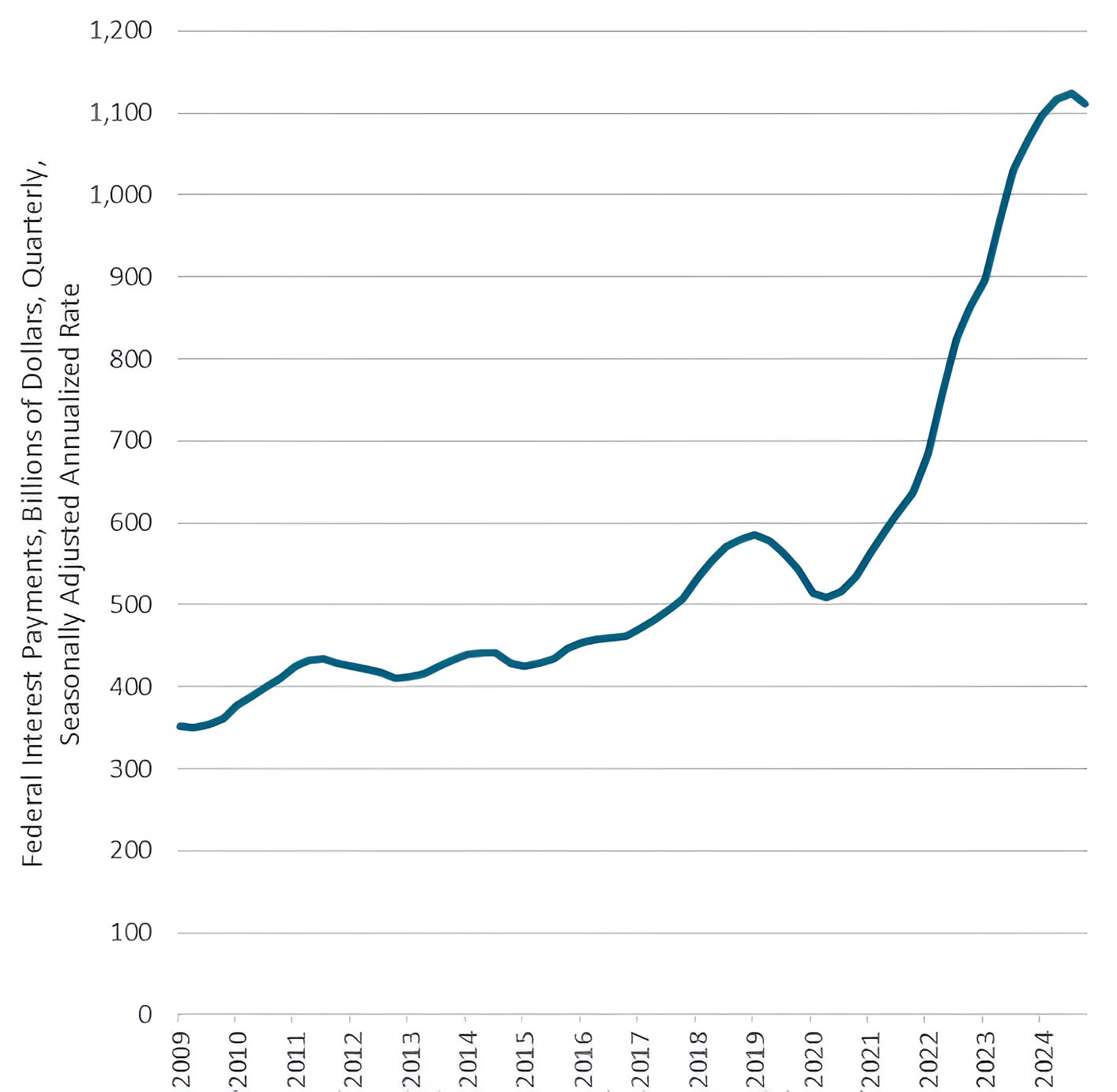 From 2020, the Interest Expense has more than doubled from $500 billion on an annualized rate to over $1.1 trillion.