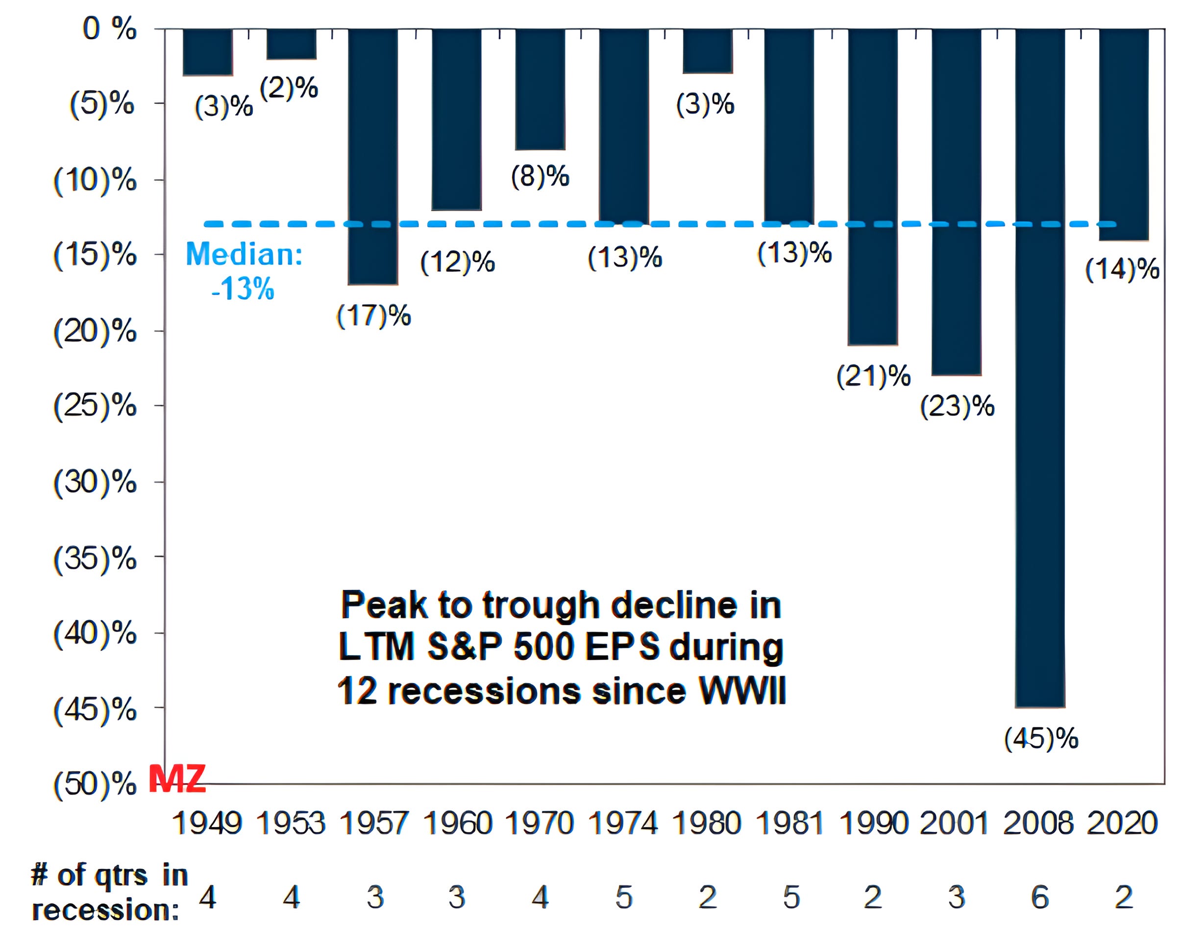 The chart above shows S&P 500 earnings declines in recessionary periods since World War 2.