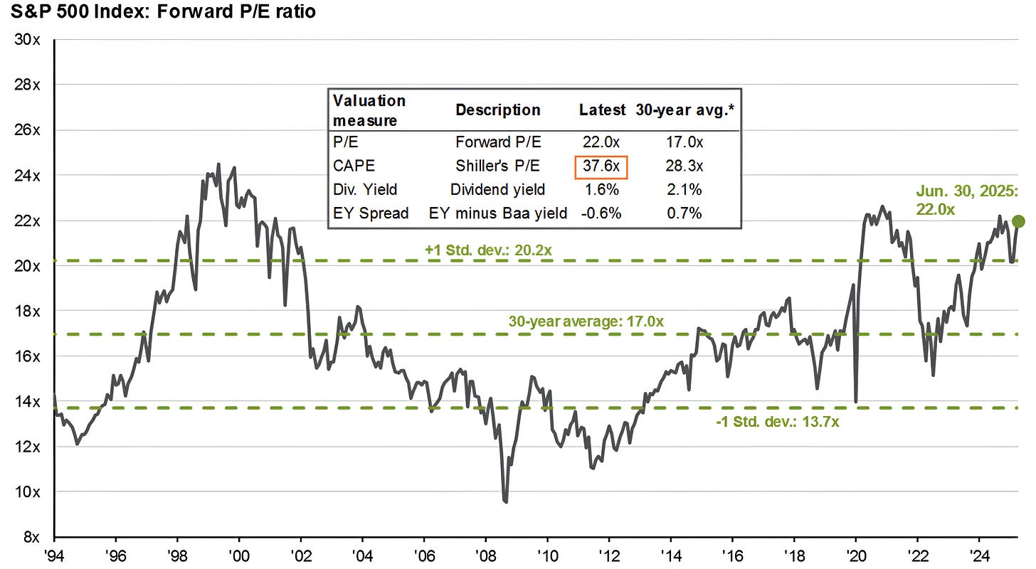 As earnings season begins next week, we will “drop” Q2 2025 earnings from the price to forward earnings calculation and replace it with Q2 2026 expected earnings. Given current earnings estimates, this calendar “flip” will reduce the price to forward earnings multiple from 22.0x to 21.2x.