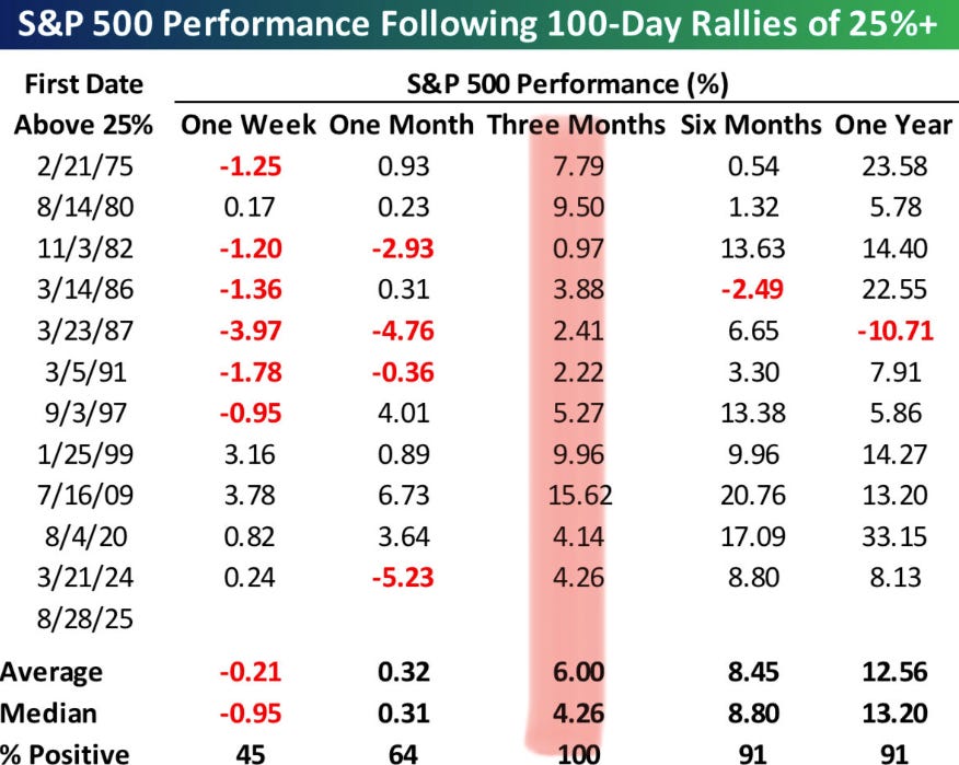 The chart above shows the S&P 500 performance subsequent to the 11 other times that it has rallied 25%+ over 100 trading days (data since 1955).