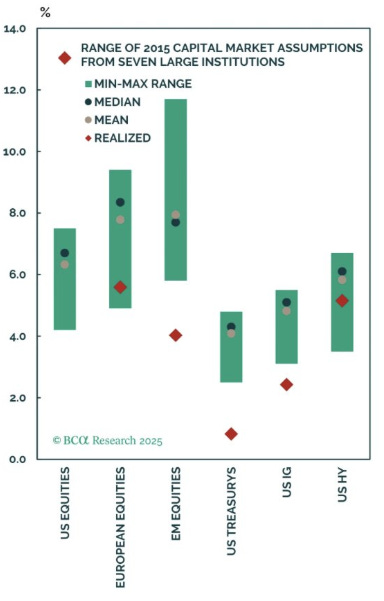 The chart above shows the min / max range (green shaded area) of the 2015 long-term return assumptions of the main asset classes from seven large institutions along with the mean (blue dot); median (grey dot); and actual results (red diamond).
